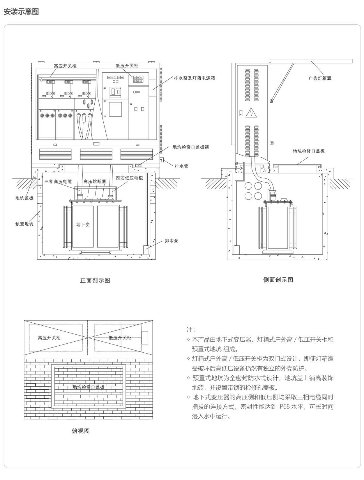 YDB系列燈箱式地下箱變主要由安裝在地下的地下式變壓器( 含預制式地坑) 和安裝在地上的戶外廣告燈箱式高低壓開關設備兩部分組成。其中,地下式變壓器是一種帶有高壓熔斷器保護,能夠一段時間內浸沒入水中運行的新型配電變壓器,在我國的機場、高速公路、橋梁、隧道等場所已經有了較為廣泛的使用;戶外燈箱式高低壓開關設備的內部為戶外高低壓配電柜,箱體外側為廣告燈箱。可以根據周圍環境、用戶要求設計廣告畫的內容。整個產品占地面積小,美觀大方,不但能與周圍環境高度協調,還能實現廣告作用。