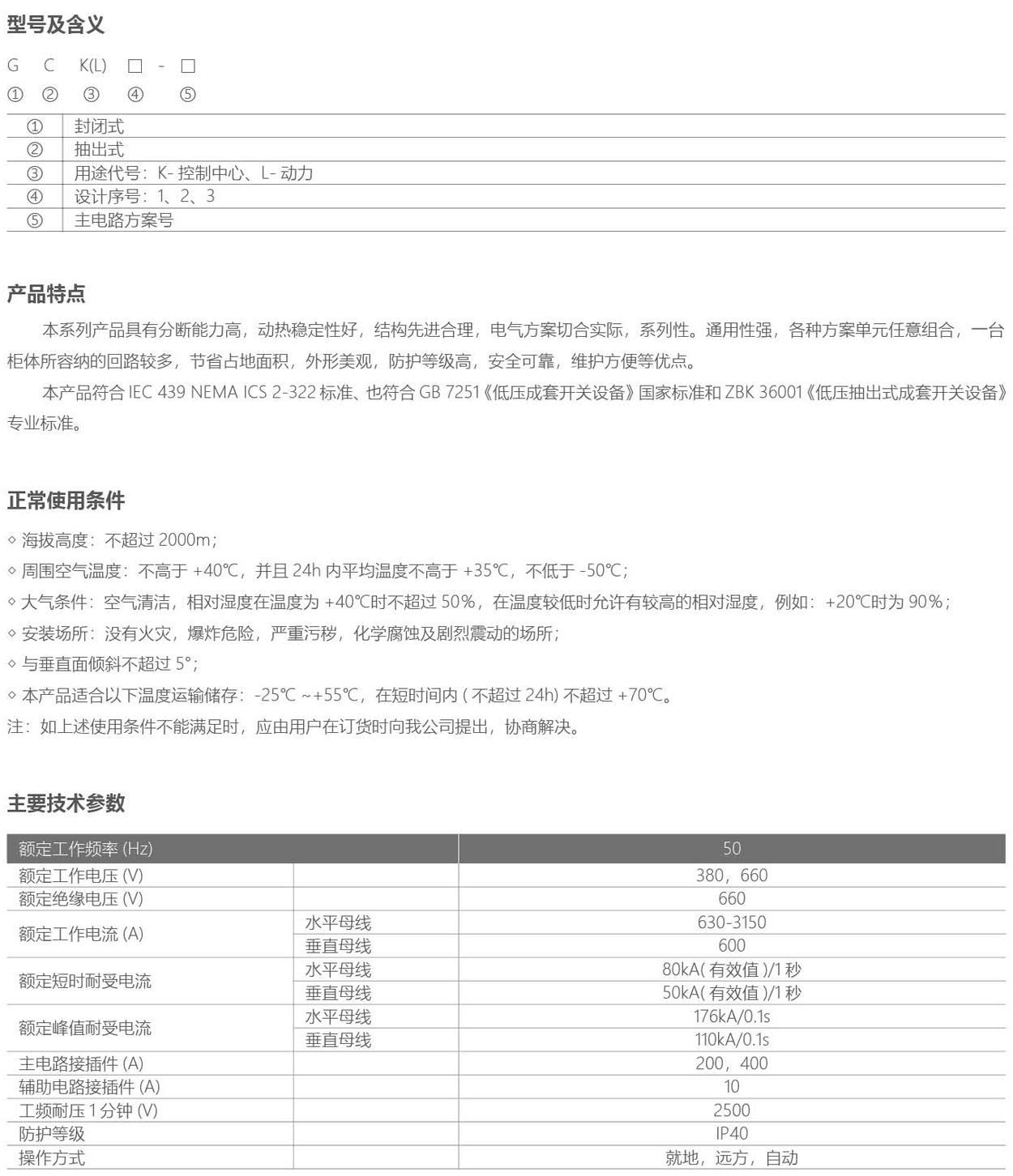 GCK系列低壓抽出式開關(guān)柜,主要是由一些組合式電動(dòng)機(jī)控制單元,和其他功能單元組合而成。這些單元以上下重疊的方式安裝在封閉的金屬柜體內(nèi)。柜體共分水平母線區(qū)、垂直母線區(qū)、電纜區(qū)和設(shè)備安裝區(qū)等四個(gè)各自的小室內(nèi),當(dāng)任何一個(gè)功能單元發(fā)生事故時(shí),均不影響其他單元,防止事故擴(kuò)大。