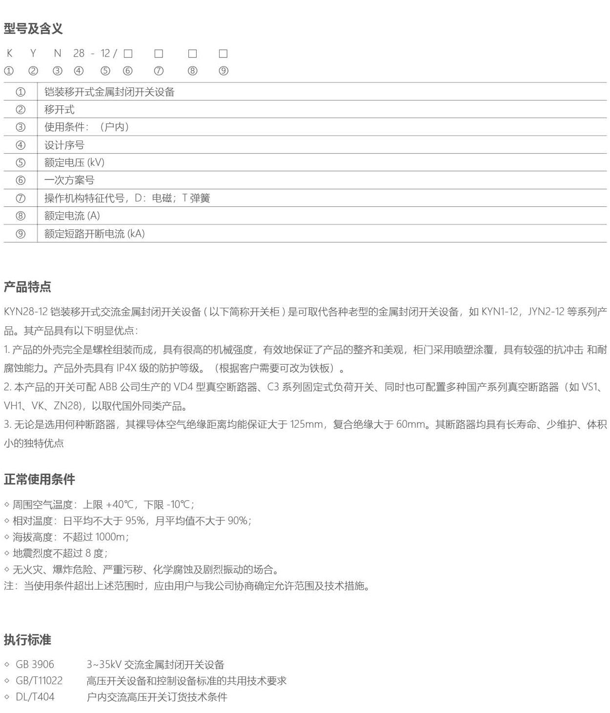 KYN28A-12鎧裝移開(kāi)式金屬封閉開(kāi)關(guān)設(shè)備適用于 3.6-12kV 三相交流 50Hz 電網(wǎng),作為接受和分配電能,并對(duì)電路實(shí)行控制、監(jiān)測(cè)和保護(hù)之用??捎糜趩文妇€、單母線分段系統(tǒng)或雙母線系統(tǒng)。開(kāi)關(guān)設(shè)備符合 IEC298《額定電壓 1kV 以上 52kV 及以下交流金屬封閉開(kāi)關(guān)設(shè)備和控制設(shè)備》、IEC694《高壓開(kāi)關(guān)和控制設(shè)備共用條款》,我國(guó) GB3906(3-35kV 交流金屬封閉開(kāi)關(guān)設(shè)備》及 DIA04《戶內(nèi)交流高壓開(kāi)關(guān)柜訂貨條件》,德國(guó) DIN.VDE0670《額定電壓 1kV 以上的交流開(kāi)關(guān)設(shè)備》等標(biāo)準(zhǔn)的要求。并具有完善、可靠的防誤操作功能。