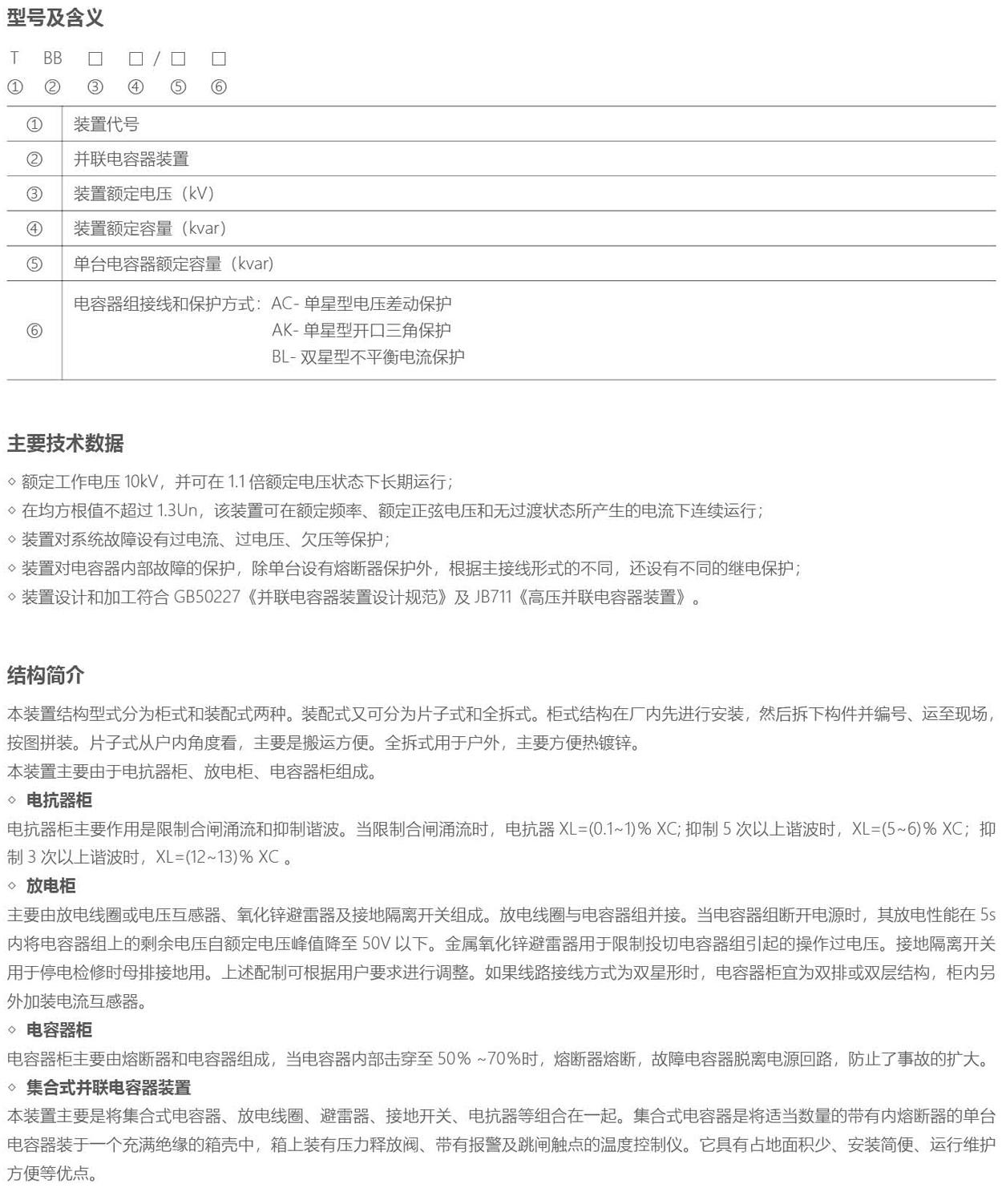 TBB 高壓并聯(lián)電容器裝置(以下簡稱裝置)適用于交流 50Hz、三相 10kV 電力系列中,用于提高功率因素和調(diào)整網(wǎng)路電壓,從而提高供電設(shè)備有功輸出和減少線路損耗。本裝置為戶內(nèi)(外)式。運(yùn)行場所不允許有爆炸危險的介質(zhì),周圍介質(zhì)中不應(yīng)含有腐蝕性和破壞絕緣的氣體及導(dǎo)電介質(zhì),不允許充滿水蒸汽及有嚴(yán)重的霉菌存在。