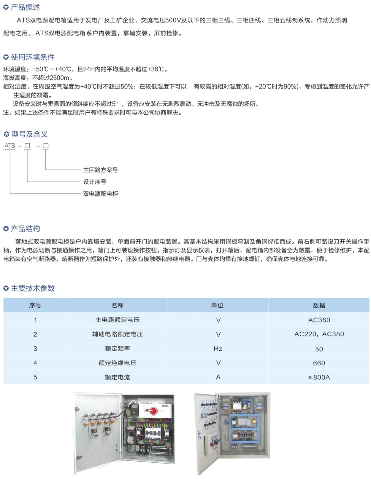 ATS雙電源配電箱適用于發電廠及工礦企業,交流電壓500V及以下的三相三線、三相四線、三相五線制系統,作動力照明配電之用。ATS雙電源配電箱系戶內裝置,靠墻安裝,屏前檢修。