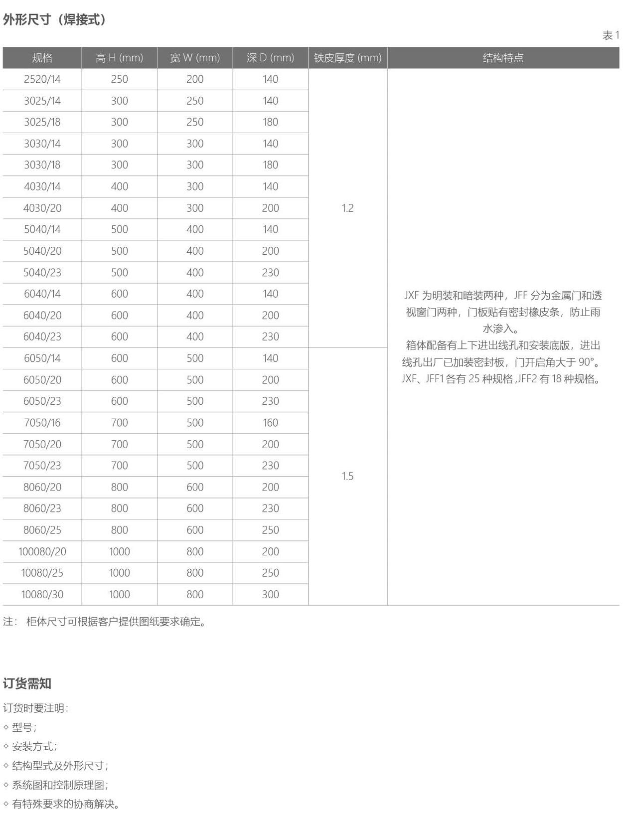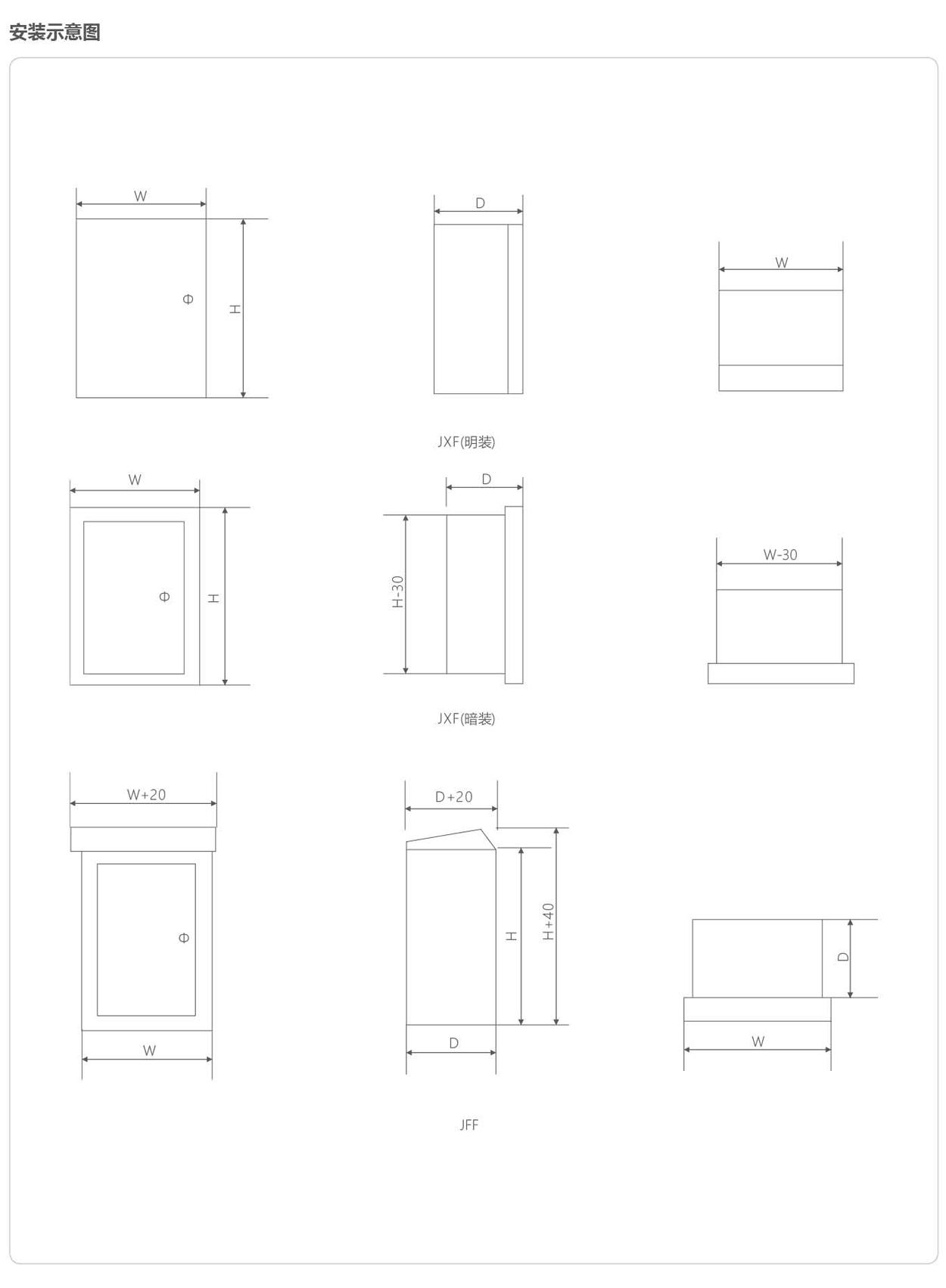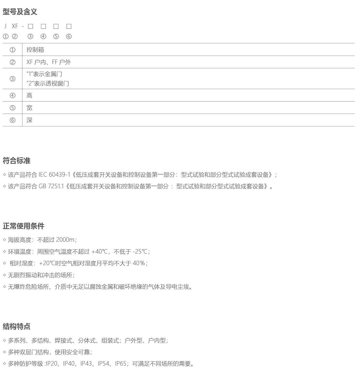 JXF掛墻式低壓動力控制箱適用于50Hz,500V及以下,負荷電流不大于250A的三相三線、三相四線、三相五線系統,對配電系統作控制、漏電保護以及電動機的過載、短路、缺相保護及各種控制。該箱設計合理,體積小、外形美觀,使用安全可靠,廣泛用于冶金,石化,醫療衛生、航空、住宅小區、商場、學校、城市改造。