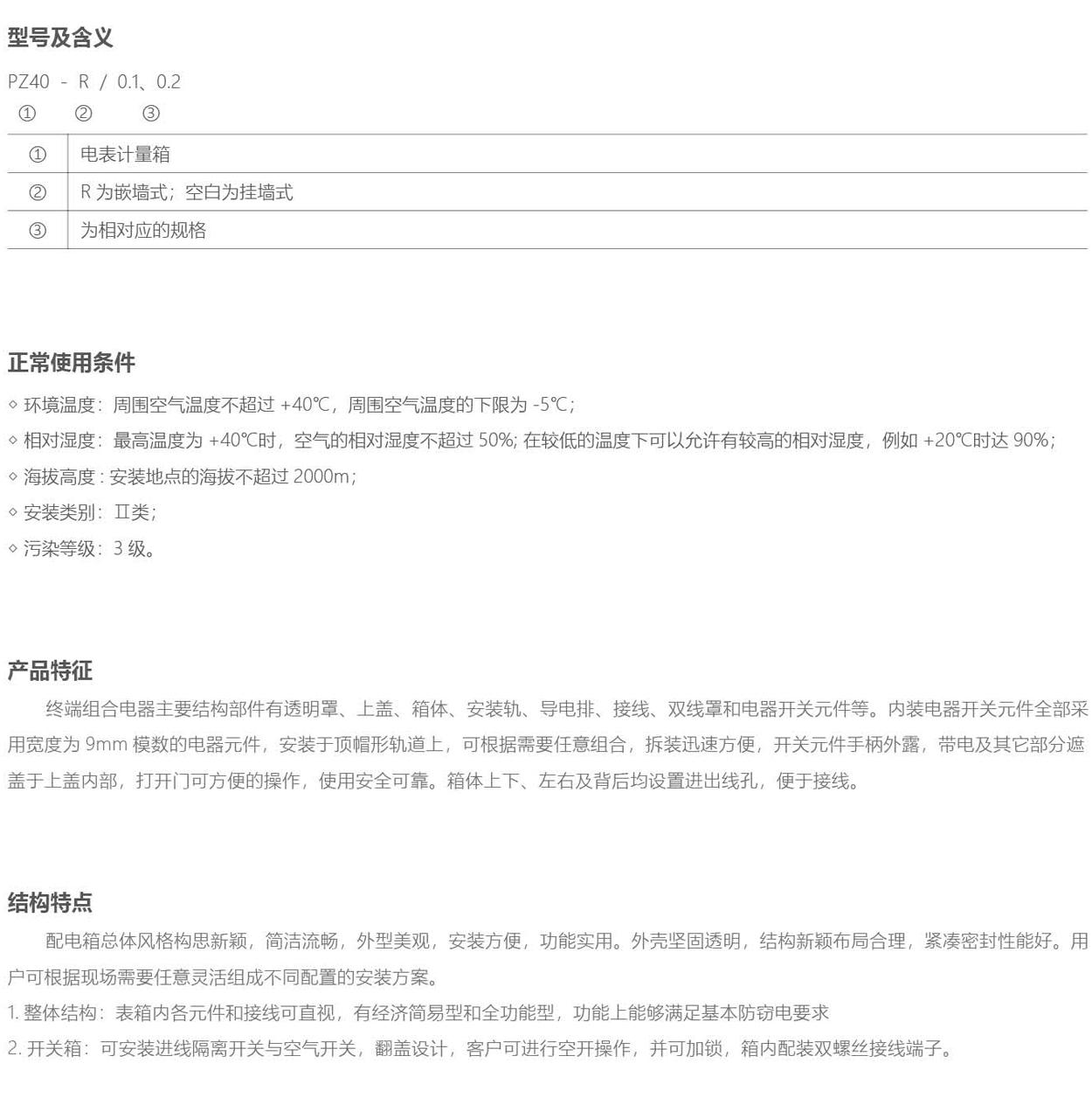 產(chǎn)品概述:PZ40配電箱是一種安裝微型開關(guān)和電度表為一體的終端計(jì)量裝置。箱體用 1~1.5mm 厚的鋼板折彎焊接而成,門的上方開有電度表透視窗。下方開孔并嵌上塑料或阻燃材料制成的面板和透明小門。便于觀察操作,內(nèi)件有...產(chǎn)品概述:PZ40配電箱是一種安裝微型開關(guān)和電度表為一體的終端計(jì)量裝置。箱體用 1~1.5mm 厚的鋼板折彎焊接而成,門的上方開有電度表透視窗。下方開孔并嵌上塑料或阻燃材料制成的面板和透明小門。便于觀察操作,內(nèi)件有...